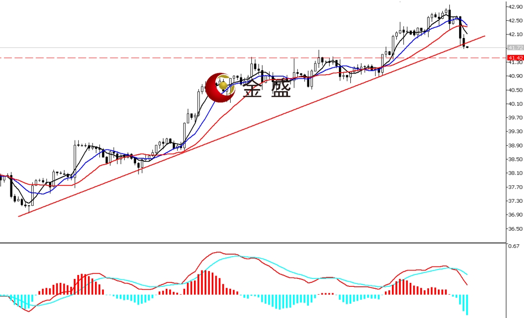 前一个交易日,白银先涨后跌走尖顶结构,价格受制于43美元一带,最终收跌0.38%。今天白盘行情延续调整,价格跌破42美元大关,多头回吐周内全部涨幅。四小时周期,均线系统收敛向下拐头,对价格上涨形成阻碍。MACD指标快慢线零轴上方现死叉,做空的动能增强,指标确认顶背离有回落的需要。白银上涨趋势不变,价格刺破图示的趋势线,多头力度减弱。行情可能进入调整周期,下方关注41美元一带的支撑。