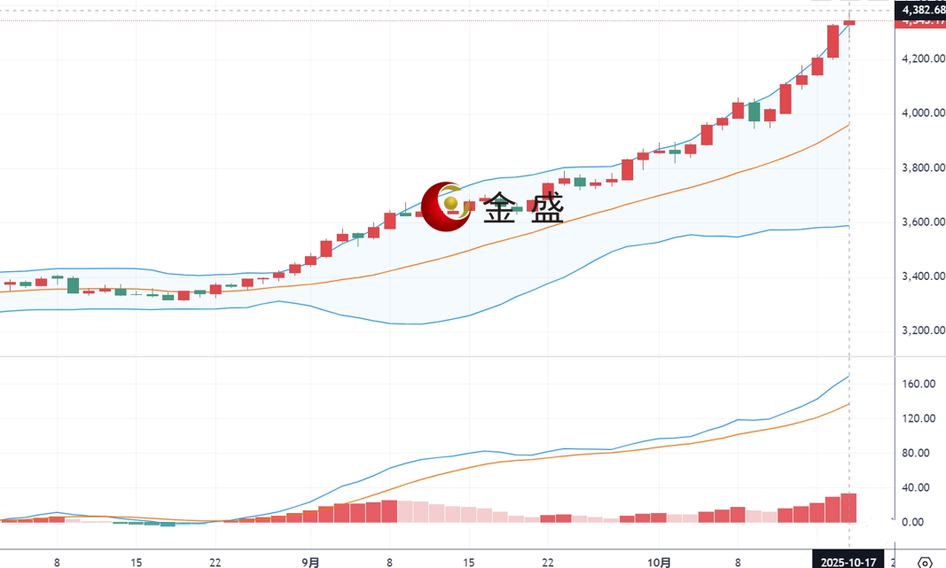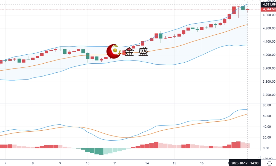 现货黄金周五(10月17日)开市于4327.90美元/盎司,盘中走出探底回升V型反转,在刷新历史高点至4379美元/盎司后,一度跌破4300美元关口,但很快受到逢低买盘支撑,一度再回升至4378美元/盎司附近。在降息预期与财政停摆风险持续发酵的背景下,金价短线仍具上行动能。然而,随着地缘紧张局势阶段性缓解,黄金的避险属性可能逐步弱化。
