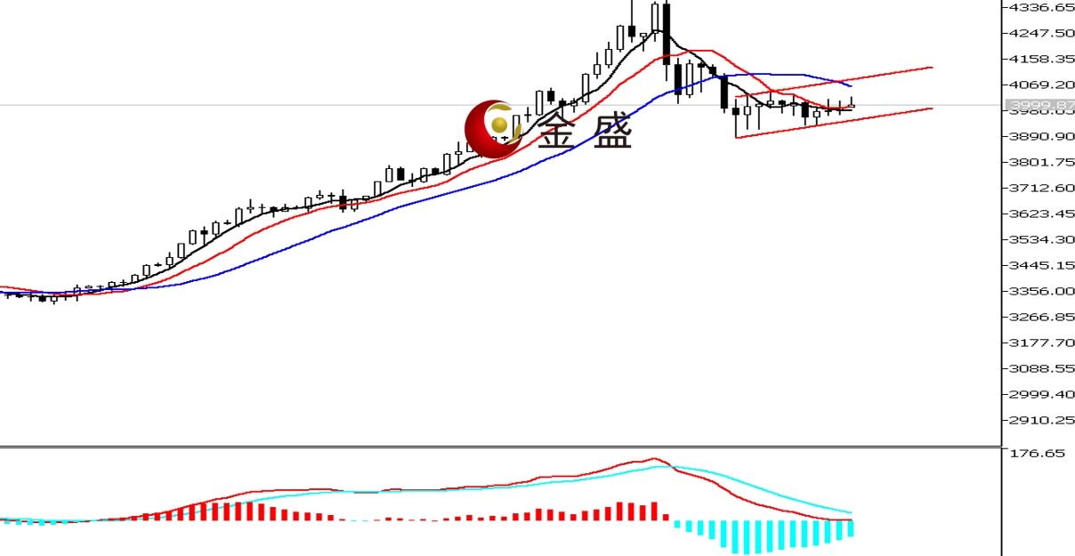 日线图,行情先跌后涨走V字型,周二跌破关键支撑,但空头未能走出延续。均线系统不断收敛,布林带中轨对价格反弹形成阻碍。MACD快慢线零轴上方现死叉,做空的动能减弱。黄金中长期上行趋势不变,短期进入高位的休整。价格连续三周调整,回调空间不及前一波上行的50%,可见多头动能依然占优。行情形成3960—4030的震荡区间,结构内盘整时间逾十天,临近变盘周期。本周尝试向下打破结构未果,下周或尝试上破区间。一旦上破,则反弹升级,走势将形成图示的上行通道。操作上调整做多为主。