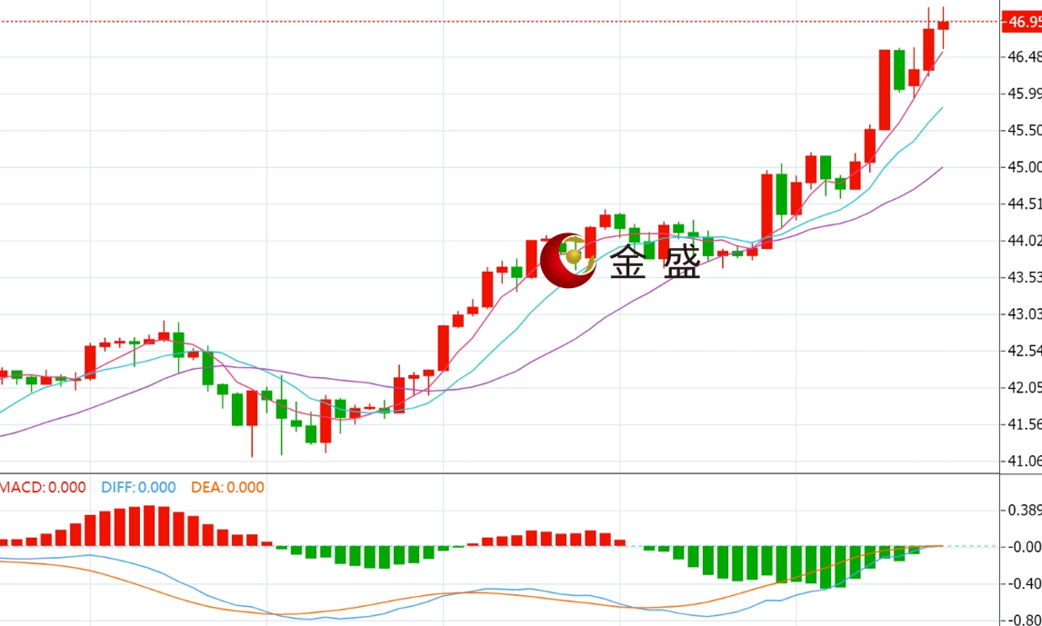 前一个交易日,白银走势与黄金同步,但上行力度更强,银价在美盘大幅拉升,并冲上46美元上方,创逾14年新高,最终收涨1.98%。今天白盘多头继续发力,价格突破47美元大关,午后有所回落。四小时周期,均线系统多头排列,运行在价格下方形成支撑。MACD指标快慢线零轴上方运行,做多的动能为主。白银上涨趋势不变,连续六周收阳。上周的阳线实体最大,即价格不断走高,多头势能不减反增,操作上调整做多为主。