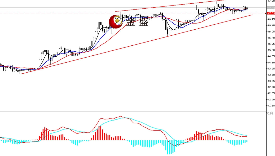 前一个交易日,白银表现偏强,价格震荡上行突破47美元大关,盘中创14年新高,最终收涨1.44%。今天白盘行情依托47美元关口横盘整理,价格运行在昨日的K线内。小时周期,均线系统不断收敛,价格围绕其震荡。MACD指标快慢线零轴上方现死叉,做空的动能减弱。白银上涨趋势不变,价格运行在图示的支撑线之上。昨日行情形成V型突破,47美元一带是第一支撑位,短期不能有效跌破,则偏向震荡上行,操作上回调低吸为主。