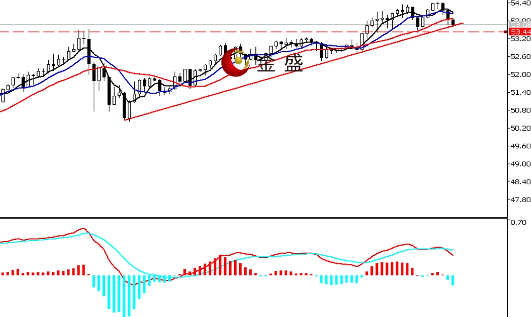 前一个交易日,白银跟随黄金上行,价格刷新周内新高站上54美元大关,最终收涨2.19%,连续两日收阳。今天白盘行情围绕54美元关口震荡,午后跌幅近1%。小时周期,均线系统不断收敛,价格跌破短期均线支撑。MACD指标快慢线零轴上方现死叉,做空的动能增强,指标出现顶背离现象。白银上行趋势不变,周内走势形成图示的支撑线。昨日行情完成V型突破,今天日内做回踩确认,53.4美元附近是多维度的支撑区,短期关注其得失。