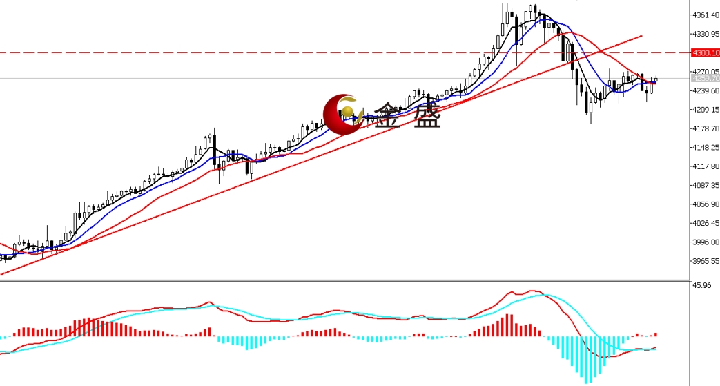 前一个交易日,美指探底回升收阳线。黄金早盘历史高点4380美元,午后再度承压此关口转跌,晚盘下挫逾一百美金,价格一度刺破4200美元大关,最终收跌1.75%。今天日内黄金以区间休整为主,价格运行在4300美元下方。小时周期,均线系统不断收敛,价格围绕其震荡。MACD指标快慢线零轴下方现金叉,做多的动能有增强。黄金上行趋势不变,但高位回调的空间加大,上周的上行趋势线被破坏,表明多头上行势头减缓。短期行情或进入震荡周期,价格或围绕4200—4300区间休整,操作上高抛低吸。