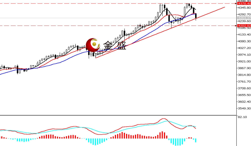 现货黄金周二(10月21日)开市于4356美元/盎司。亚欧盘时段,美指继续反弹,多头收复上周大部分跌幅。黄金承压前高震荡调整,午后特朗普发表讲话,中美贸易摩擦缓解,金价跳水一百美金。截止目前,金价最高4374.92美元/盎司,最低4244.45美元/盎司。 黄金上行趋势不变,昨日大幅拉升至新高,今天深度回调,多空围绕4300美元关口陷入拉锯战。市场波动如此剧烈,可能与中美贸易战有关,短期做好风险管理为主。行情高位形成箱体雏形,价格回落至趋势线一带,短期关注4240美元一带的得失。