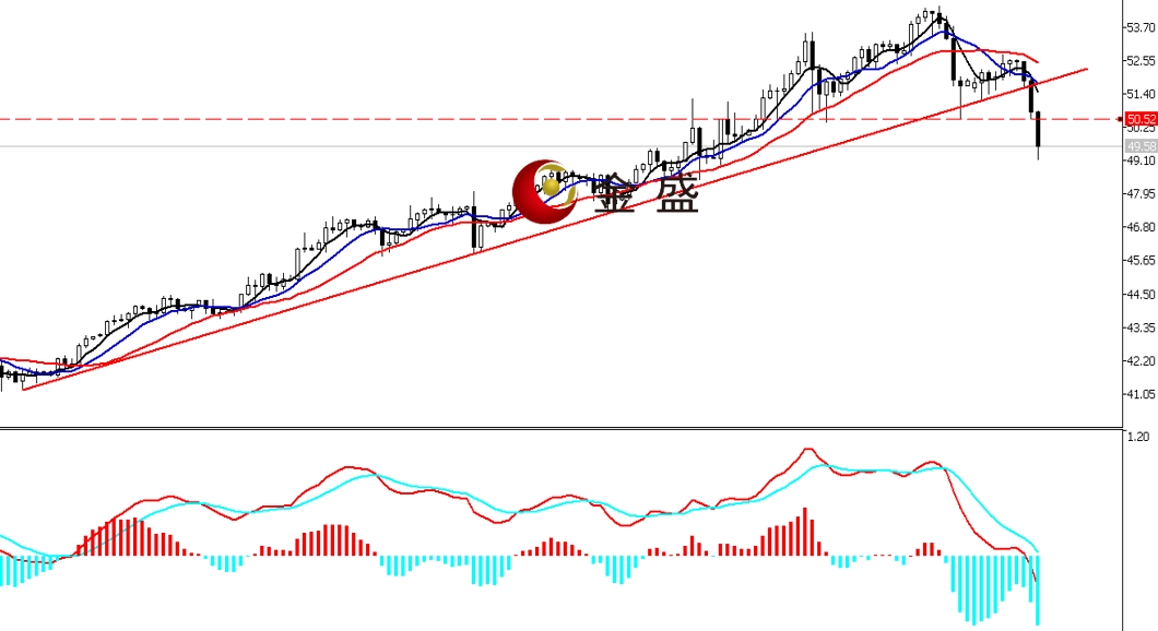 前一个交易日,白银多头势能放缓,行情跟随黄金弱势反扑,价格未触及53美元关口,最终收涨1.01%。今天白盘震荡下行为主,午后金价跳水,白银加速下行跌破51、50美元大关。四小时周期,均线系统收敛向下拐头,对价格反弹形成压制。MACD指标快慢线零轴上方现死叉,做空的动能增强。白银上行趋势不变,日图出现反转信号。高位震荡偏弱,未能形成头肩顶形态。价格跌破图示的趋势线,确认调整空间加大。短期关注49美元一带的得失,此处是周图五日线的支撑位,操作上高抛低吸。