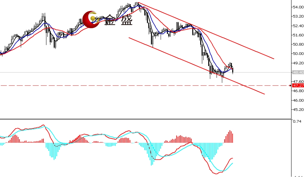 前一个交易日,白银走势与黄金同步,行情单边下行,价格失守50美元大关。最终收跌7.11%。今天日内探底回升走V字型,午后回吐部分涨幅。小时周期,均线系统不断收敛,价格围绕其震荡。MACD指标快慢线零轴下方现金叉,做多的动能增强。白银进入调整周期,价格持续下挫,形成图示的下行通道。当前依托通道下轨有反弹,但高度有限,短期或再度确认前低一带47.2美元的支撑,操作上等待止跌企稳博弈反弹。