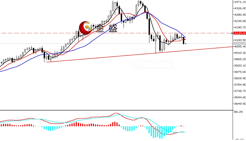 前一个交易日,美指承压99美元关口盘整收小K线。黄金震荡上行,价格重返周三高点附近,当日波动近九十美金,最终收涨0.66%。今天白盘行情持续下挫,午后连续阴线加速走低,多头回吐昨日全部涨幅。四小时周期,均线系统收敛向下拐头,对价格反弹形成阻碍。MACD指标快慢线零轴下方走平,做多的动能衰竭。黄金依托四千关口盘整逾两天,K线形成孕线结构。反弹高度不及前一波调整的50%,多头力度暂时偏弱。今晚市场迎来CPI数据,重点关注四千关口的得失。