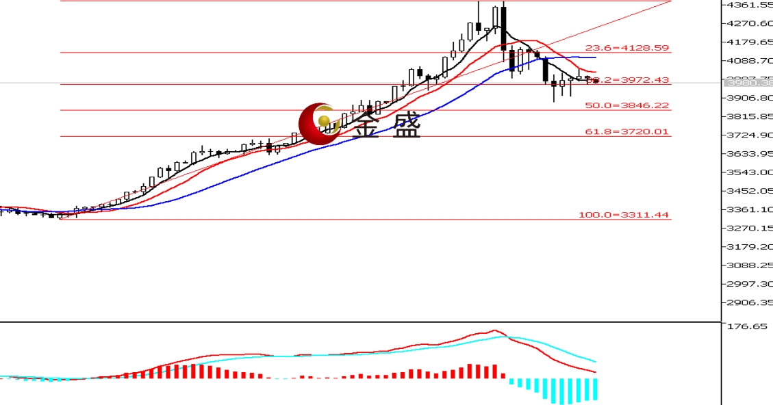 前一个交易日,早盘时段,黄金短暂拉升至日内高点4045.91美元转跌,午后险守四千美元大关有所反弹。晚盘时段,行情延续调整,盘中一小时下次逾四十美金,价格最低至3972.26美元,尾盘略有反抽,日图收有影线的小阴K。均线系统收敛向下拐头,运行在价格上方形成压力。MACD指标快慢线零轴上方现死叉,做空的动能减弱。行情进入高位快速下挫后的休整阶段,3900美元关口有止跌迹象。今天早盘价格跳空低开,四千关口再度失守,强化4020美元一带的压力,短期看区间震荡,操作上高抛低吸。