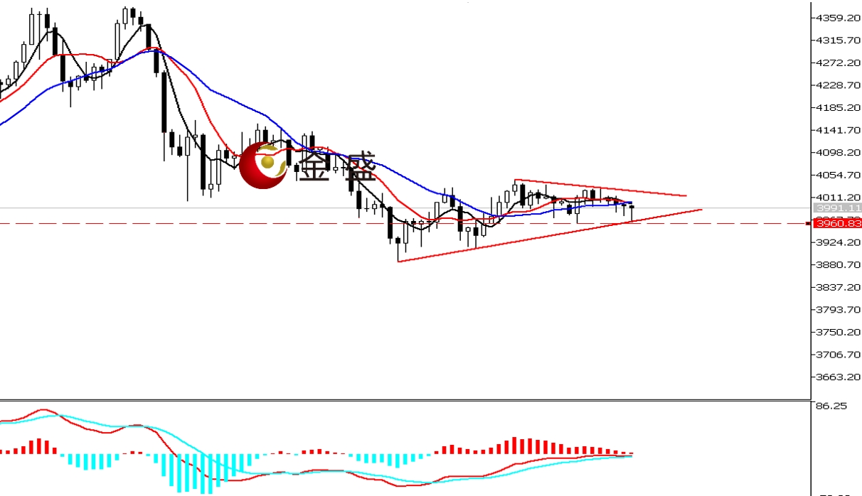 现货黄金周二(11月4日)开市于4001.13美元/盎司。亚欧盘时段,美指刺破百元大关转跌,午后逼近昨日低点。黄金承压四千关口震荡下行,午后止跌回升收复日内大部分跌幅。截止目前,金价最高4005.42美元/盎司,最低3966.59美元/盎司。昨日晚间黄金在有经济数据利好的加持下,价格不涨反跌,可见多头上攻意愿不强,短期或继续震荡蓄势。走势形成收敛三角形结构。今天午后回踩下轨有反抽,短期关注区间如何打破,操作上调整做多为主。