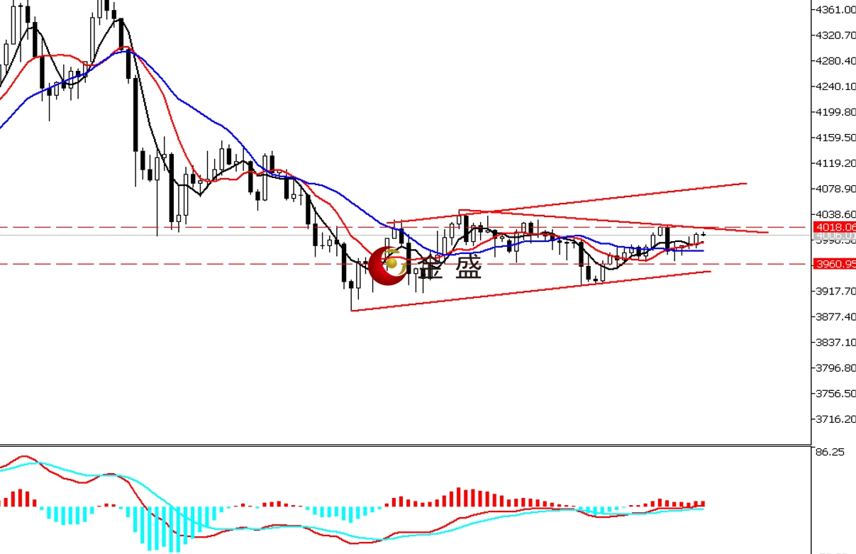 前一个交易日,美指延续调整跌破100美元大关收阴。黄金白盘持续上涨逾1%,晚盘回吐全部涨幅,全天上演过山车走势,最终收十字星。今天白盘行情震荡上行,收复昨日大部分跌幅,价格重回四千上方。四小时周期,均线系统收敛向上拐头,运行在价格下方形成支撑。MACD指标快慢线零轴下方现金叉,做多的动能为主。行情四千附近震荡逾九天,走势可能形成上行通道。周内多空博弈空间在不断收窄,构筑三角形结构。上方强压力位看4020美元一带,下方多空分水岭在3960美元附近。短期看行情如何走出整理结构。