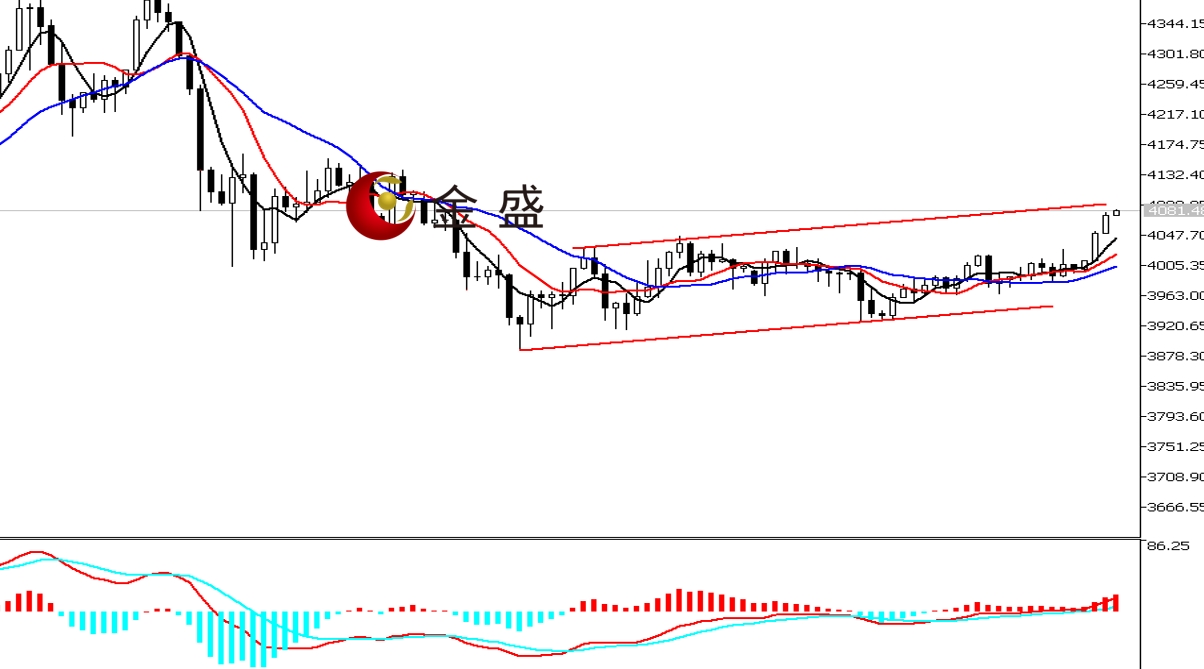 前一个交易日,美消费者信心跌至三年低位,美指继续调整,日图完成三连阴。黄金区间震荡为主,价格重心有所上移,多头重新收复四千关口,最终收涨0.61%。今天白盘行情单边上涨,价格突破上周高点,午后最大涨幅逾2%。四小时周期,均线系统收敛向上拐头,运行在价格下方形成支撑。MACD指标快慢线零轴下方现金叉,做多的动能为主。上周行情延续区间震荡,盘中尝试下破结构未果。今天选择向上突破区间上轨4030美元一带,确认反弹升级。价格形成上行通道,短期关注4080附近的压力,不能突破则偏向有调整,操作上低吸为主。