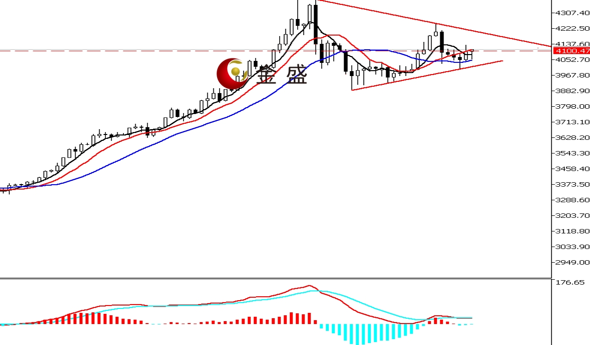 前一个交易日,早盘时段,黄金依托4060美元一带震荡上行,午后一小时拉升逾三十美金,强势冲上4100美元关口。晚盘时段,行情延续上行,最高创当日高点4132.53美元,随着美指突破100美元大关,黄金承压回吐日内全部涨幅,尾盘会议纪要显鹰派,黄金横盘震荡,最终收长上影的十字星。均线系统收敛不断走平,价格围绕其震荡。MACD指标快慢线零轴附近运行,做多的动能衰竭。黄金技术形态构成收敛三角形,后市看结构内震荡蓄势。昨日尝试突破4100美元一带未果,但今天早盘重新站上此关口,表明市场看涨意愿较强。短期依然关注整数关口的得失。
